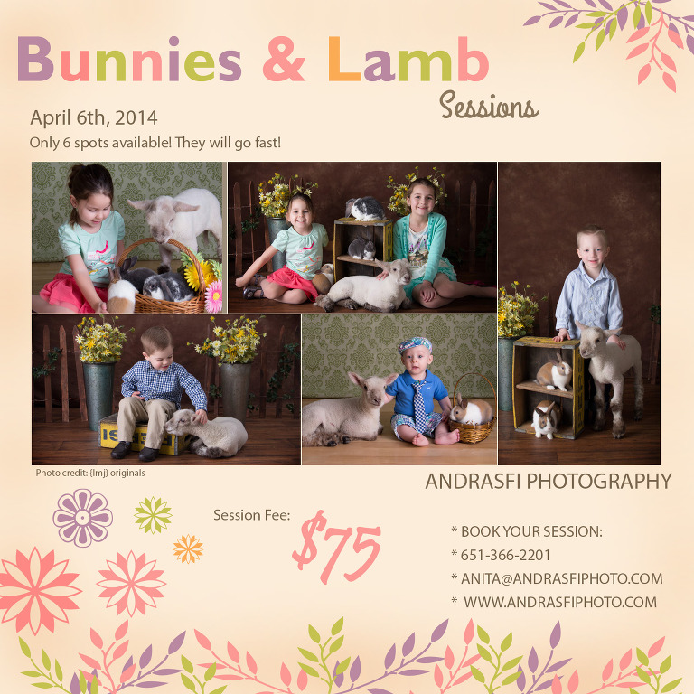 Andrasfi Photography is having real bunnies and a baby lamb in the studio on April 6th 2014. There will be 6 available spots. If interested signing up please contact Anita.