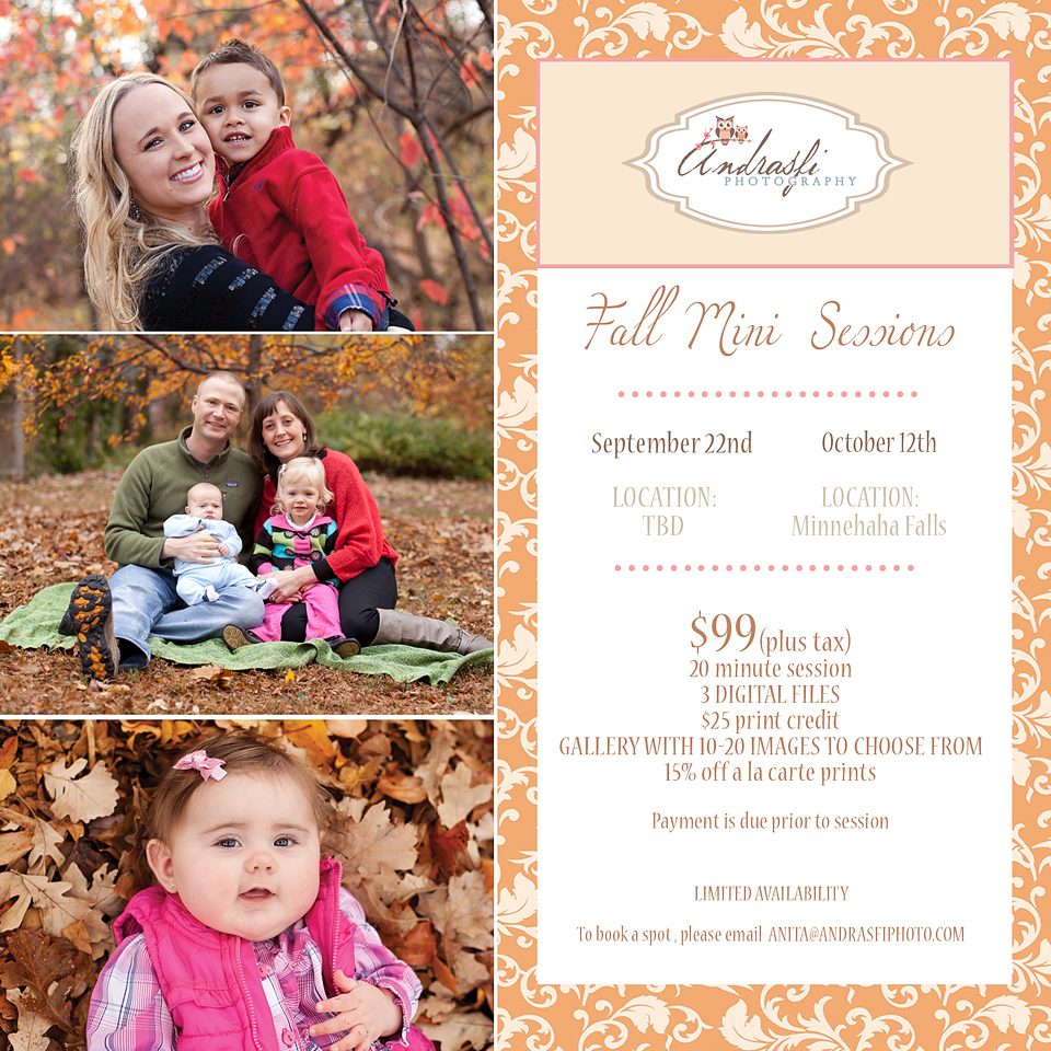 I know so many of you have been waiting for this announcement and finally it is here! I am going to offer two dates for the fall mini sessions. September 22nd (location to be determined, still finalizing a few things ) and October 12th at Minnehaha Falls (in case of bad weather the minis will be held at the studio in Downtown Saint Paul).